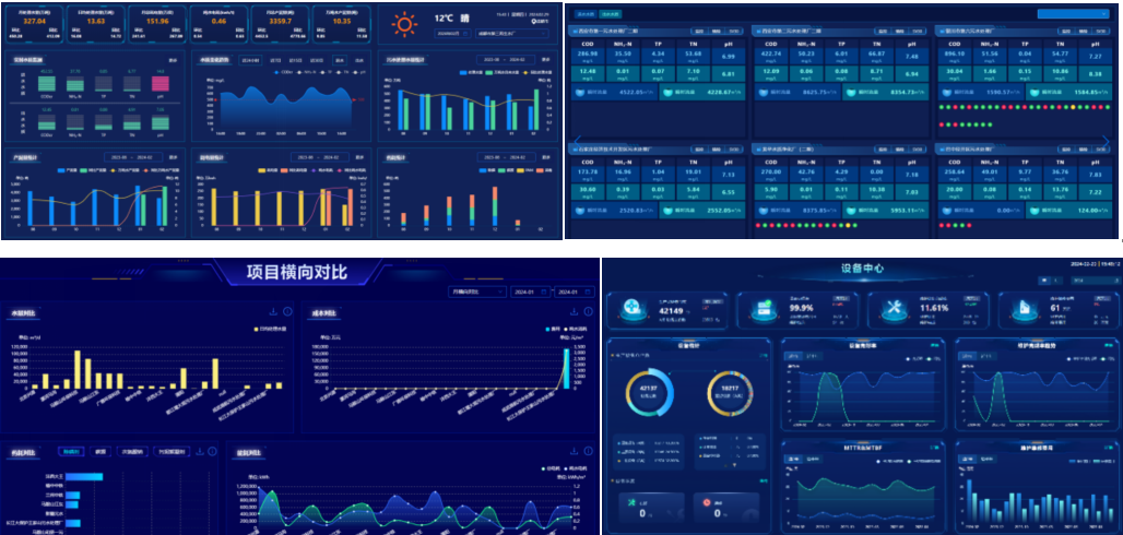 基于海量數據,挖掘數據價值,從不同的角度出發,包括數據中心、生產中心、項目橫向對比、設備中心等,通過多個可視化數據展示頁面,全面了解運營相關水電藥泥、設備、運維等各類數據,利用數據為管理者提供決策參考。